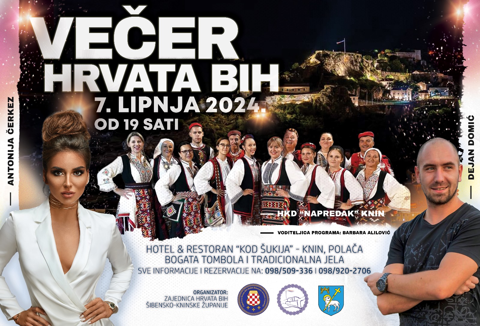 Svečana manifestacija „Večer Hrvata Bosne i Hercegovine“ održat će se u petak, 7. lipnja s početkom u 19:00 sati u restoranu „Kod Šukija“ u Polači, Knin. Očekuje nas svečana večera i zabava uz glazbene nastupe Antoniette Čerkez i Dejana Domića te HKD “Napredak Knin”. Ovaj poseban događaj bit će prigoda da zabljesnete u svečanoj odjeći, a službeni fotograf će zabilježiti najljepše trenutke.