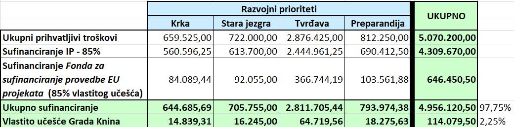 Novu godinu započinjemo sa upravo odobrena 4 projekta iz Intervencijskog plana Grada Knina, ukupne vrijednosti 5.070.000 kn. Od ukupnog iznosa, 97,75% su bespovratna EU sredstva, a preostalih 2,25% ukupnog iznosa, ili 114.079,50 kn, predstavlja vlastito učešće Grada Knina. Sljedeći, ujedno i posljednji, korak je izrada Odluke o sufinanciranju i potpisivanje Ugovora o sufinanciranju.
