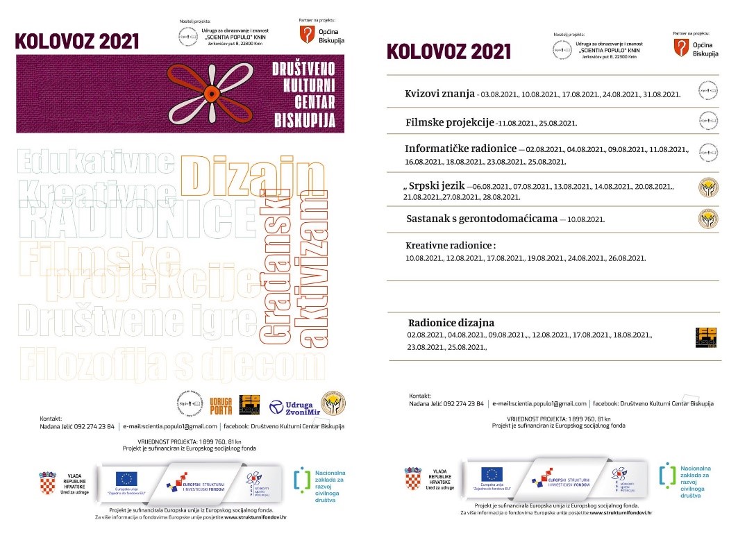 Kroz kolovoz održavat će se Kvizovi znanja, filmske projekcije, Informatičke radionice, Srpski jezik i radionice dizajna. Sve radionice održavaju se u prostorijama DKC Biskupija.