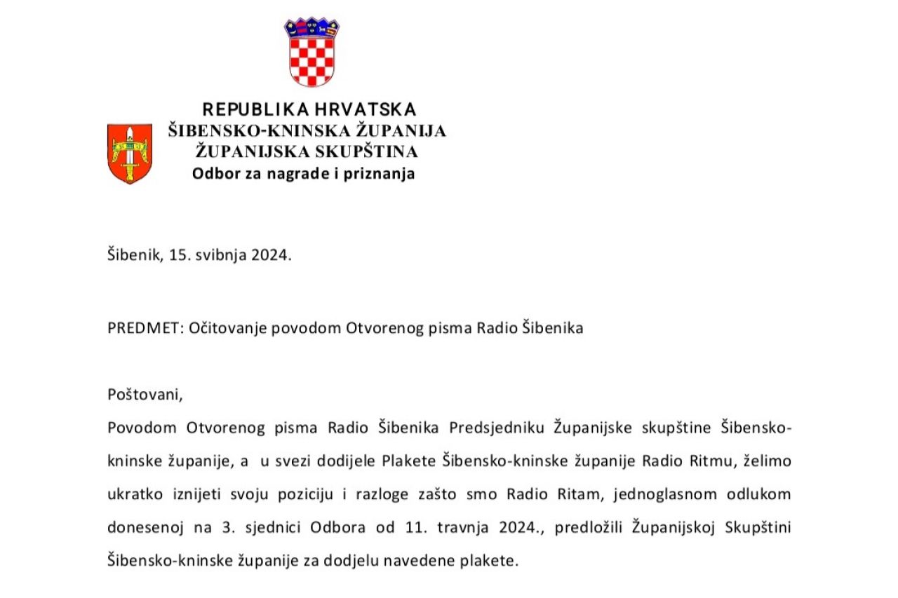 Povodom Otvorenog pisma Radio Šibenika Predsjedniku Županijske skupštine Šibensko-kninske županije, a u svezi dodijele Plakete Šibensko-kninske županije Radio Ritmu, želimo ukratko iznijeti svoju poziciju i razloge zašto smo Radio Ritam, jednoglasnom odlukom donesenoj na 3. sjednici Odbora od 11. travnja 2024., predložili Županijskoj Skupštini Šibensko-kninske županije za dodjelu navedene plakete.