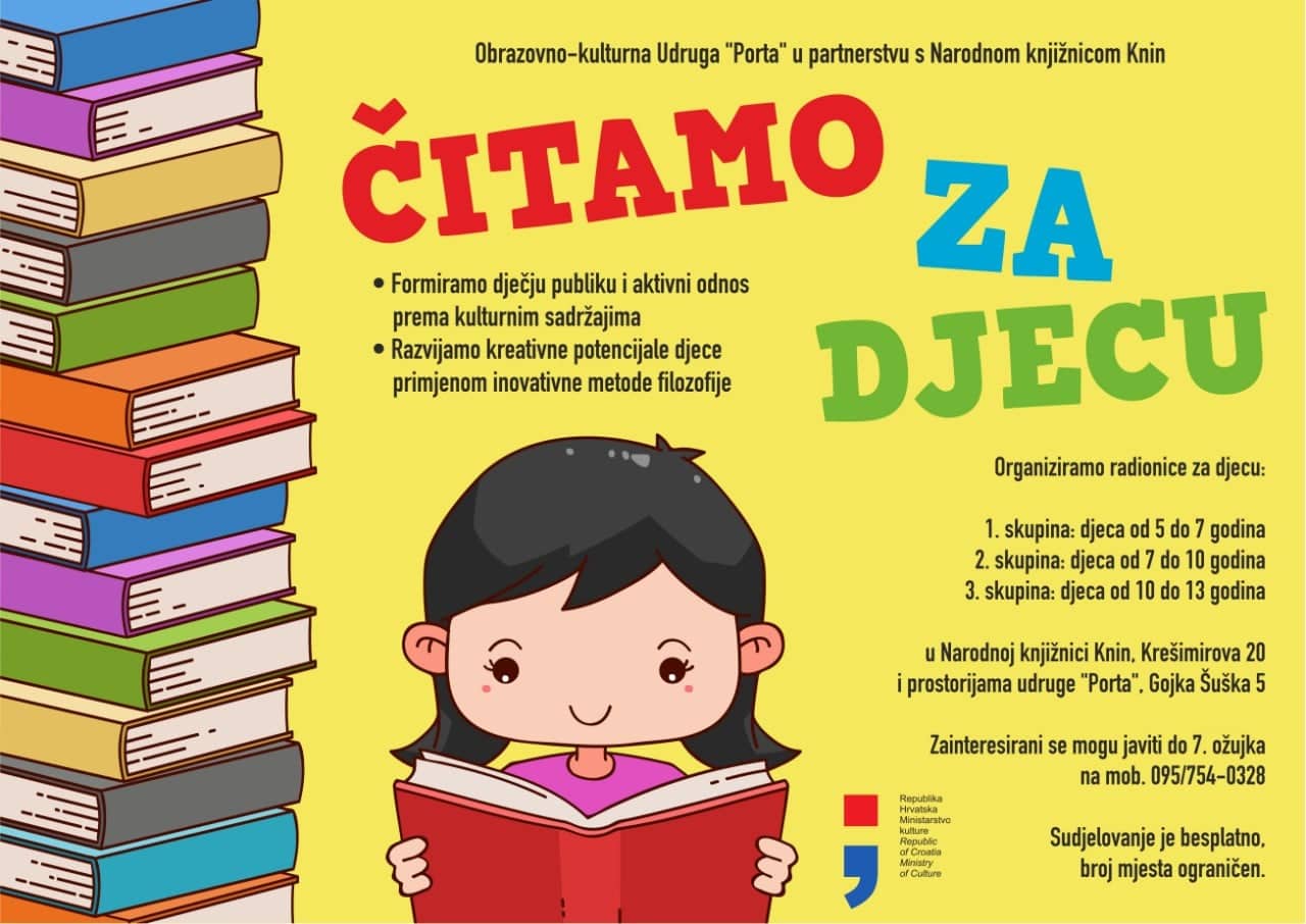 Obrazovno-kulturna Udruga „Porta“ iz Knina u partnerstvu s Narodnom knjižnicom Knin započinje provedbu projekta „Čitamo za djecu“ od 1. ožujka ove godine. Projekt se provodi već drugu godinu za redom i financira ga Ministarstvo kulture kroz program javnih potreba u kulturi za 2019. godinu.